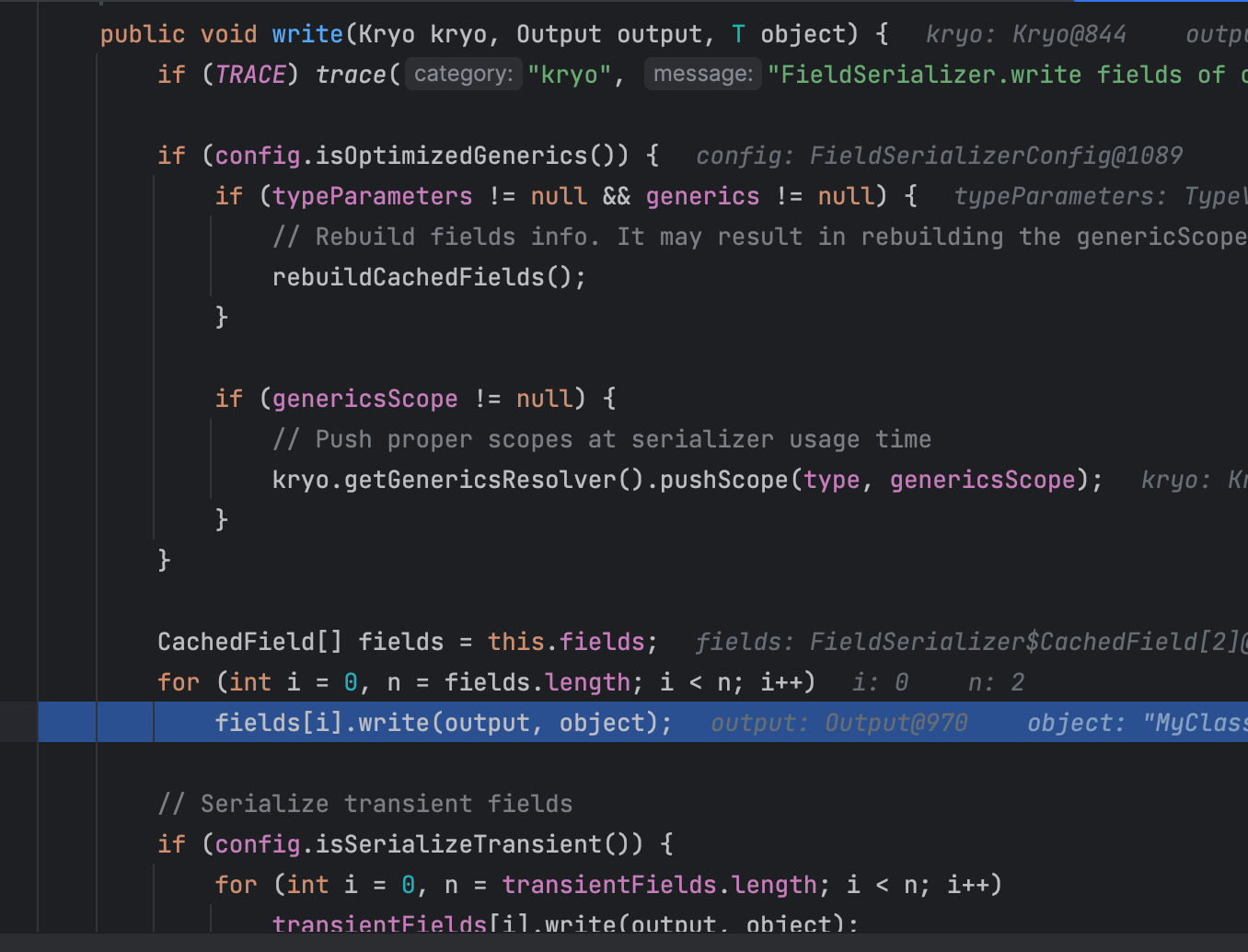 1 2 3 4 5 6 7 8 9 Kryo kryo = new Kryo(); kryo.register(SomeClass.class); Output output = ... SomeClass object = ... kryo.writeObject(output, object); Kryo kryo = new Kryo(); kryo.register(SomeClass.class, 9); kryo.register(AnotherClass.class, 10); kryo.register(YetAnotherClass.class, 11);