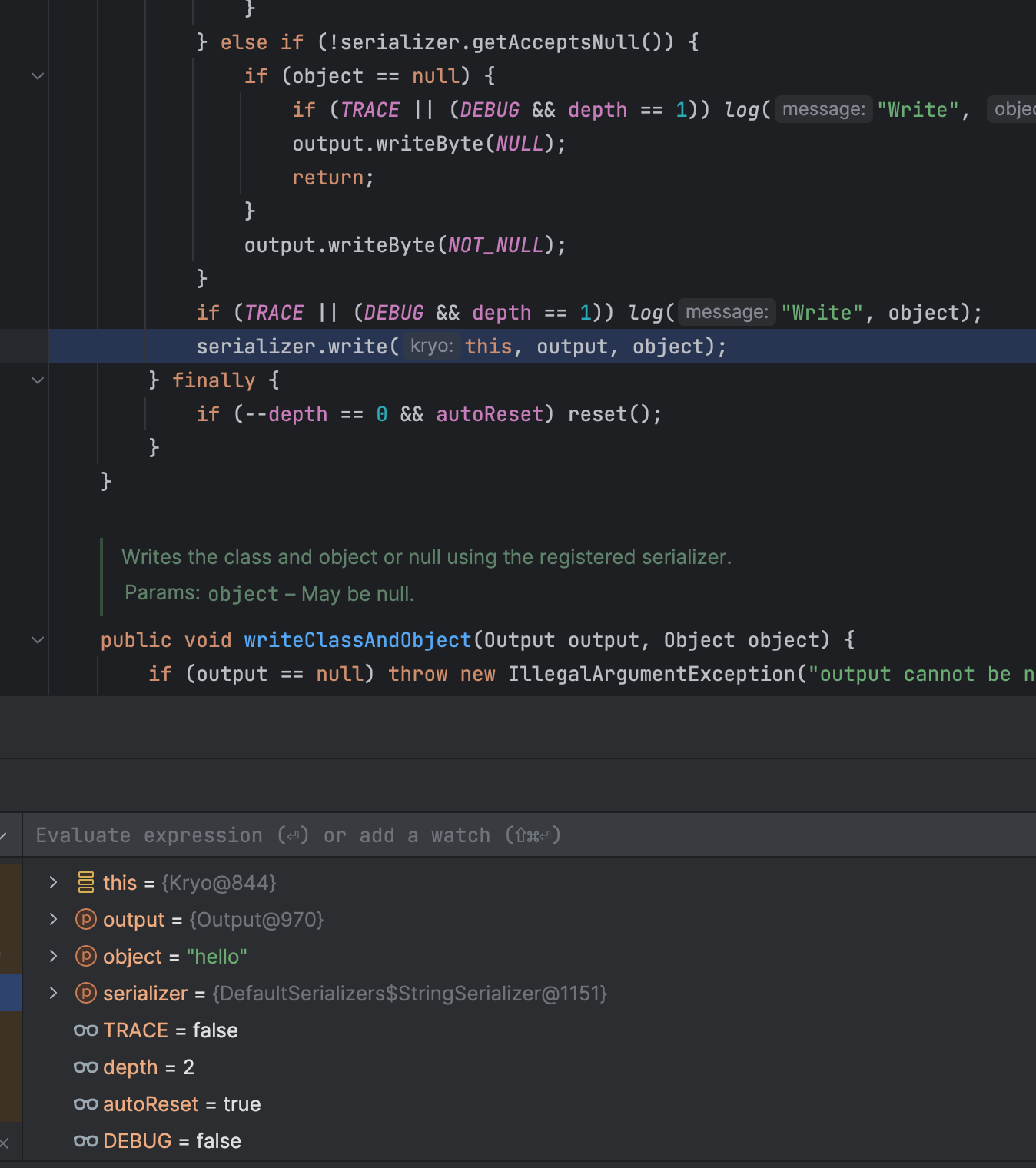 1 2 kryo.writeObjectOrNull(output, object); SomeClass object = kryo.readObjectOrNull(input, SomeClass.class);