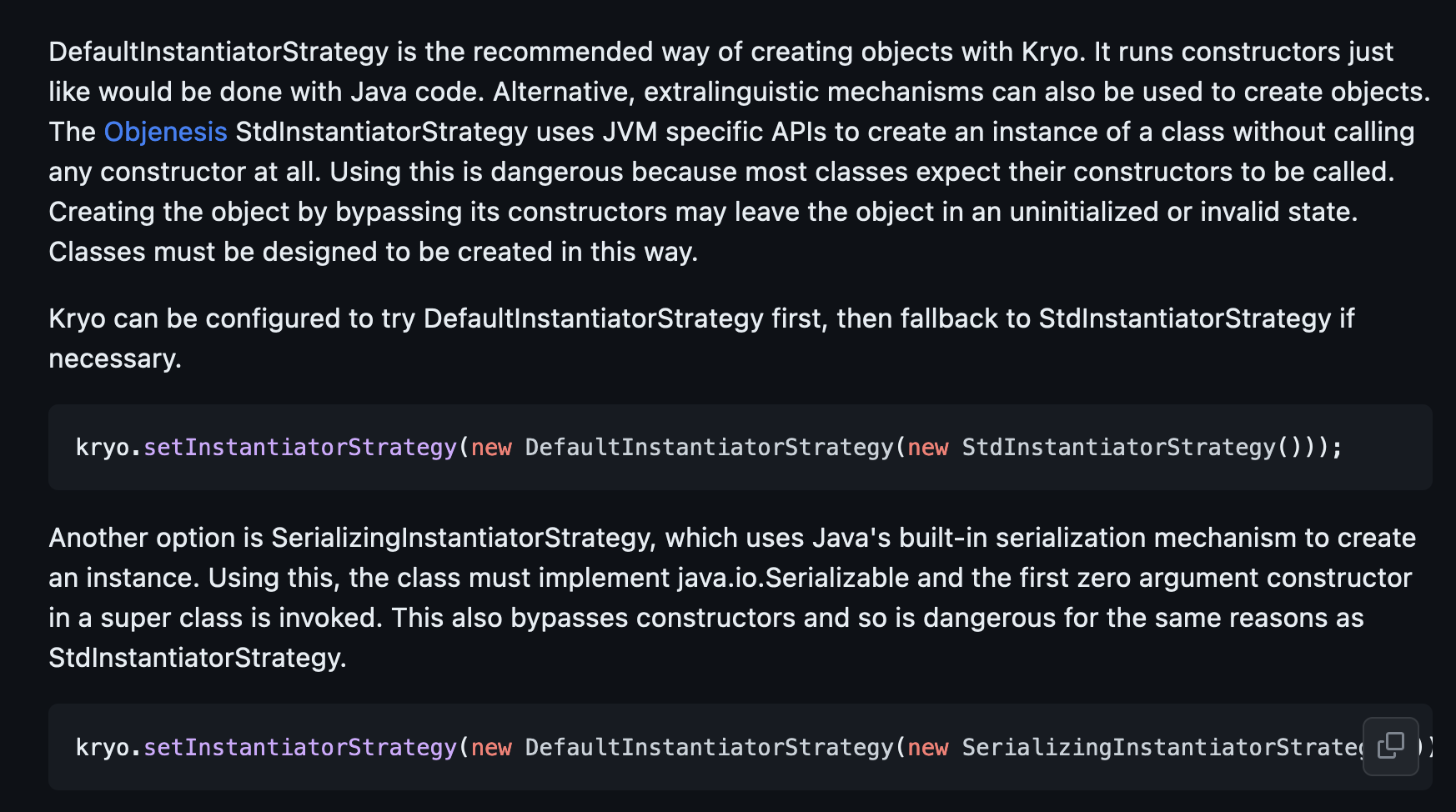 The Objenesis StdInstantiatorStrategy uses JVM specific APIs to create an instance of a class without calling any constructor at all. Using this is dangerous because most classes expect their constructors to be called.kryo.setInstantiatorStrategy(new DefaultInstantiatorStrategy(new StdInstantiatorStrategy()));