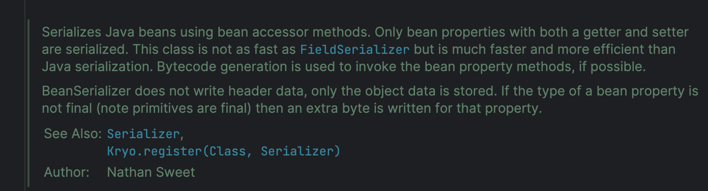 1 2 3 4 5 6 7 8 9 10 11 12 13 14 15 16 17 18 19 20 21 22 23 24 25 package org.example; import com.esotericsoftware.kryo.Kryo; import com.esotericsoftware.kryo.io.Input; import com.esotericsoftware.kryo.io.Output; import java.nio.file.Files; import java.nio.file.Paths; public class Test { public static void main(String[] args) throws Exception { Kryo kryo = new Kryo(); kryo.register(MyClass.class); MyClass myClass = new MyClass(); myClass.setHello("Hello Kryo"); myClass.setNum(11); Output output = new Output(Files.newOutputStream(Paths.get("file.bin"))); kryo.writeObject(output, myClass); output.close(); Input input = new Input(Files.newInputStream(Paths.get("file.bin"))); MyClass obj = kryo.readObject(input, MyClass.class); input.close(); System.out.println(obj); } }