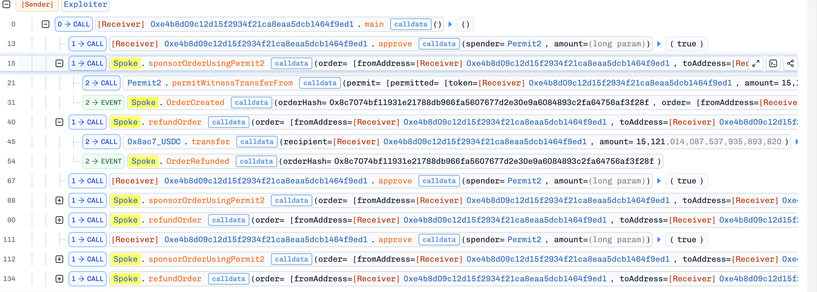 根据攻击者输入结合合约代码可以看出:合约未验证 permit.permitted.token == order.fromToken