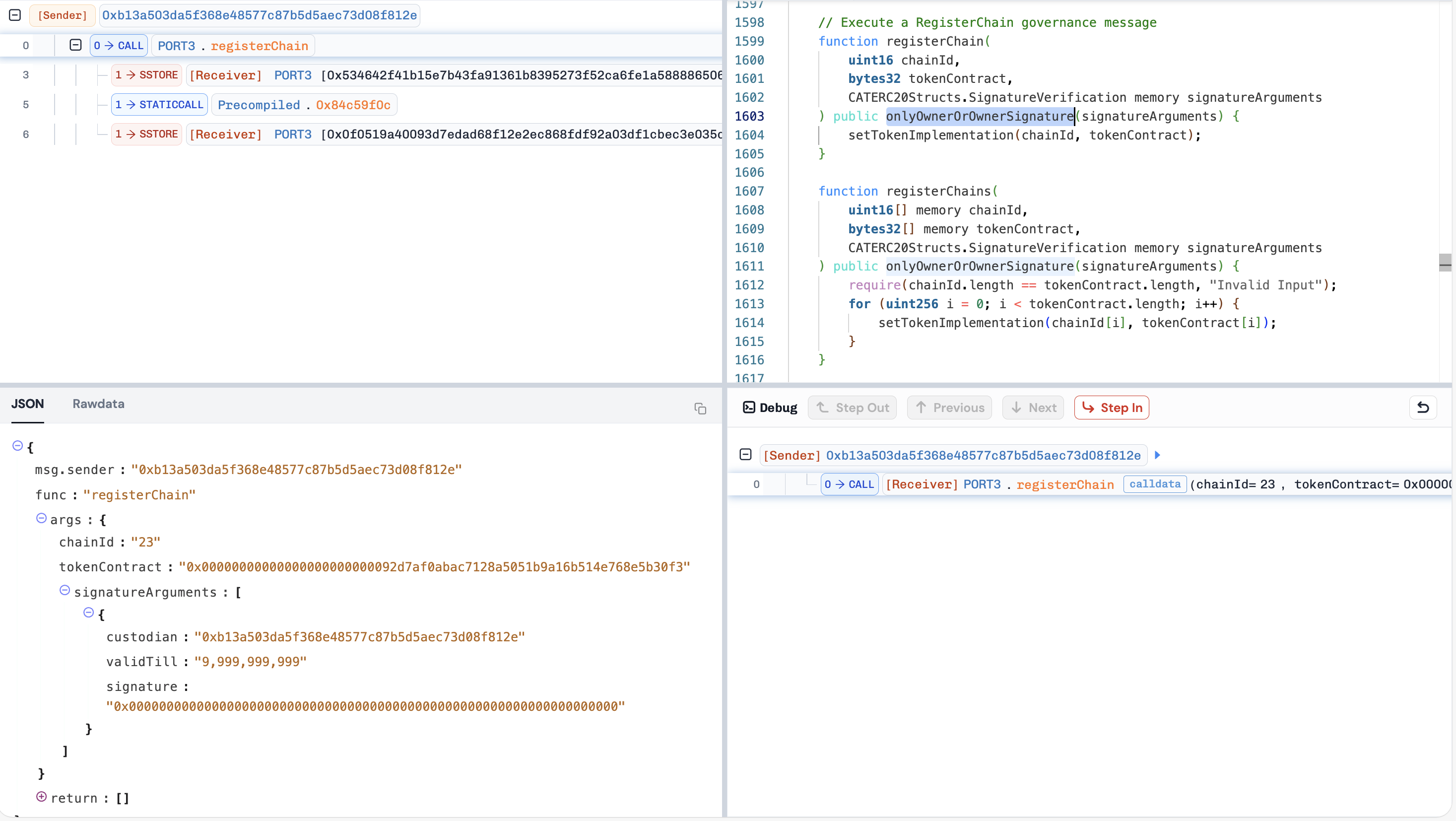 首先进入了registerChain(哪些链上的哪个代币合约地址发来的跨链消息是可信的,可以让我 mint 出代币。)