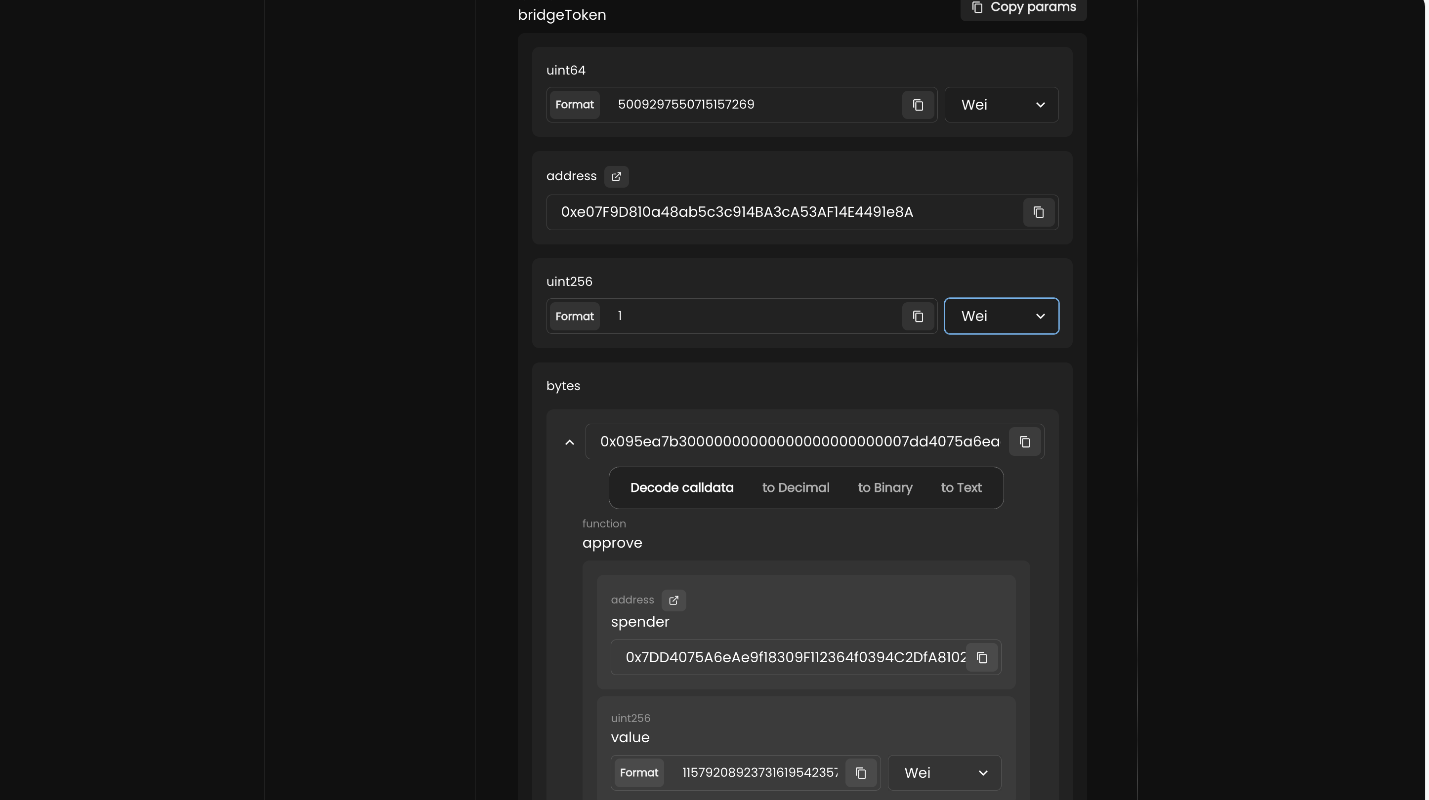 https://calldata.swiss-knife.xyz/decoder?tx=0x51c22898a9b9f519a10b0a0be89b9d51c0248adb80cc0f89e57437e15e6c60c7&chainId=42161