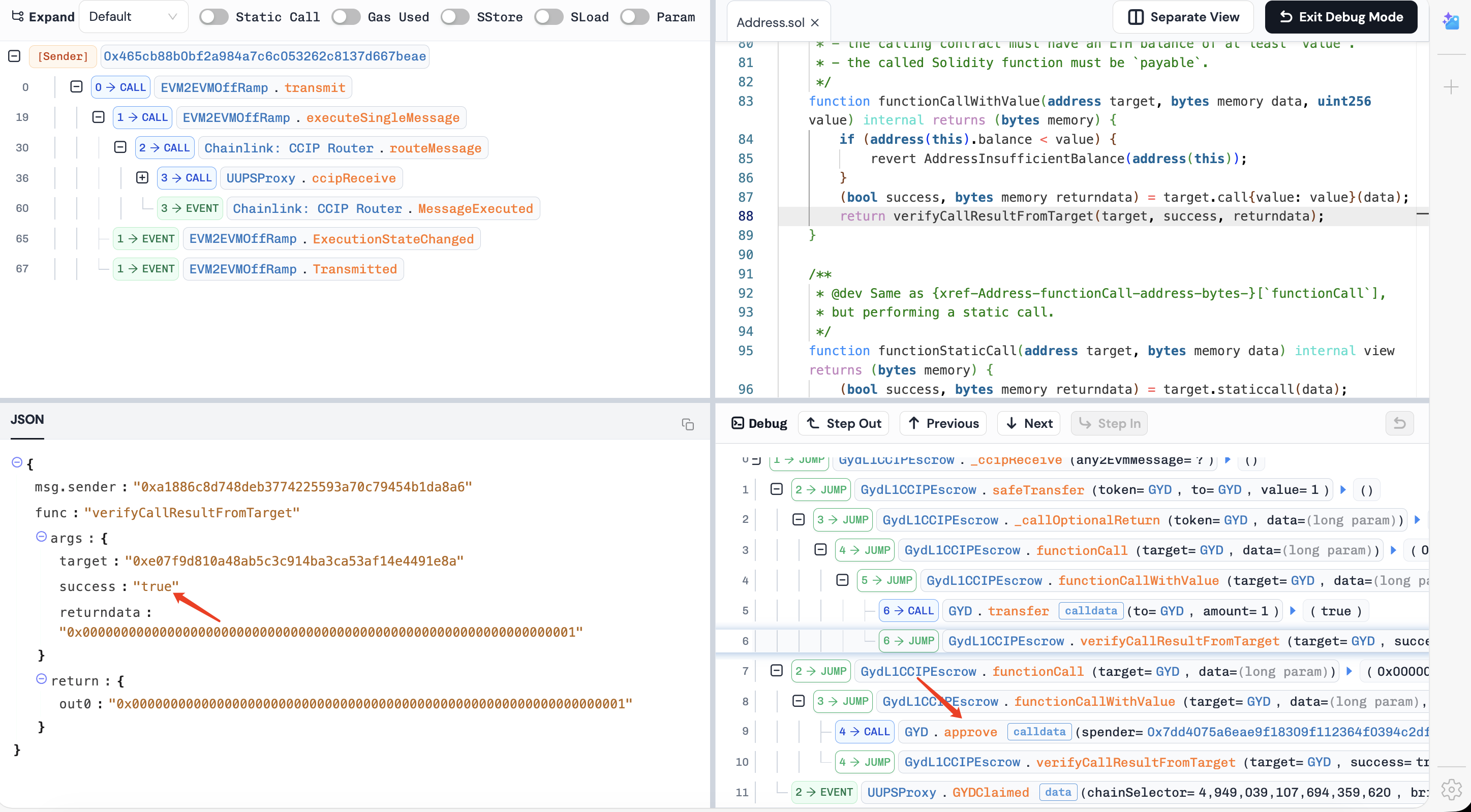 ETH侧的GydL1CCIPEscrow.ccipReceive()验证发送者(Arbitrum的L2Gyd),解码消息,转移1 wei到GYD(无影响,只是满足参数),然后执行GYD.functionCall(data) → GYD.approve(attacker, max),以escrow为msg.sender。