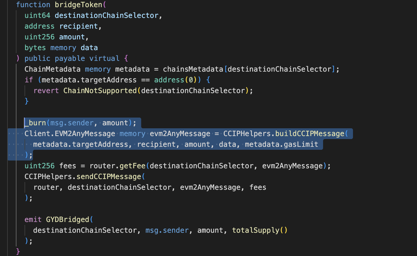 我认为逻辑在arb侧的L2Gyd.bridgeToken()的和eth侧的GydL1CCIPEscrow.ccipReceive() 都有问题。但是eth侧的GydL1CCIPEscrow.ccipReceive()问题最大,一般接收消息更应该做好处理。