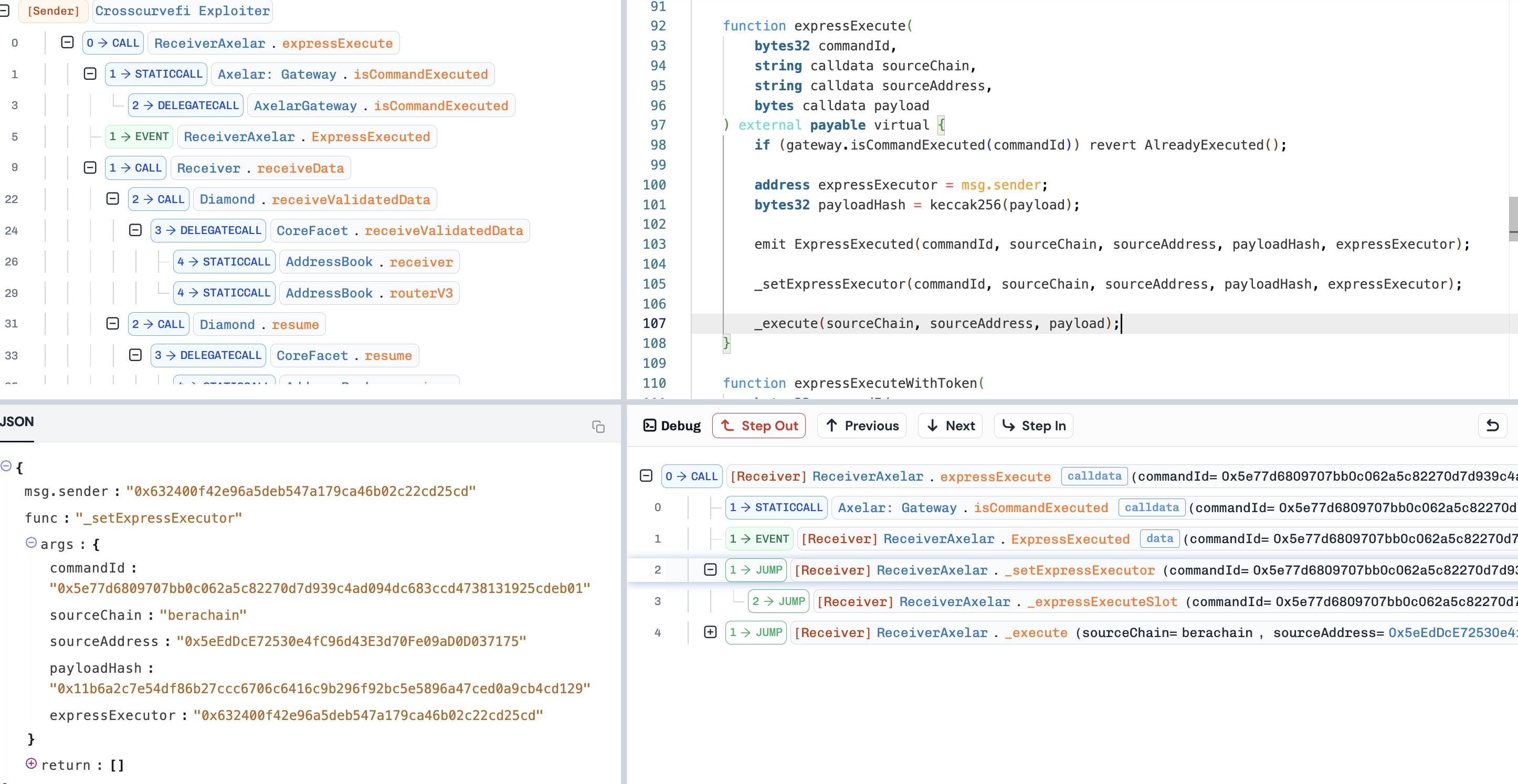 综上:expressExecute 本意是 Axelar 的“快速执行”模式,允许用户预支付 gas 来加速跨链调用(后续由真实消息退款)。但在 CrossCurve 的实现中,它允许攻击者注入任意 sourceChain、sourceAddress 和 payload,直接触发内部逻辑,而不等待真实跨链消息的到来和验证。这相当于打开了一个“后门”,让攻击者伪造跨链指令。