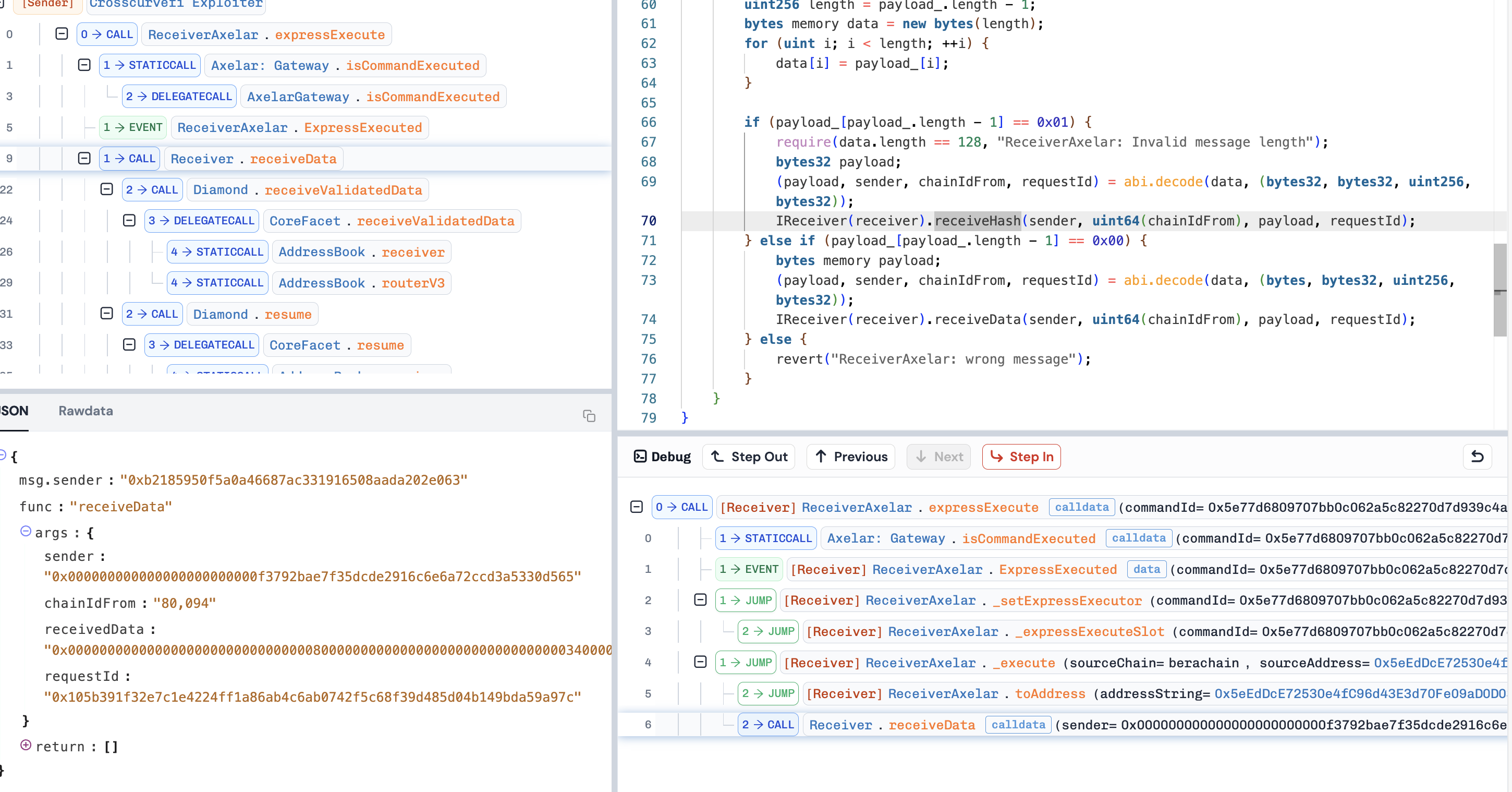 这个漏洞的Receiver 在”已验证的跨链消息”上执行了危险的任意逻辑.