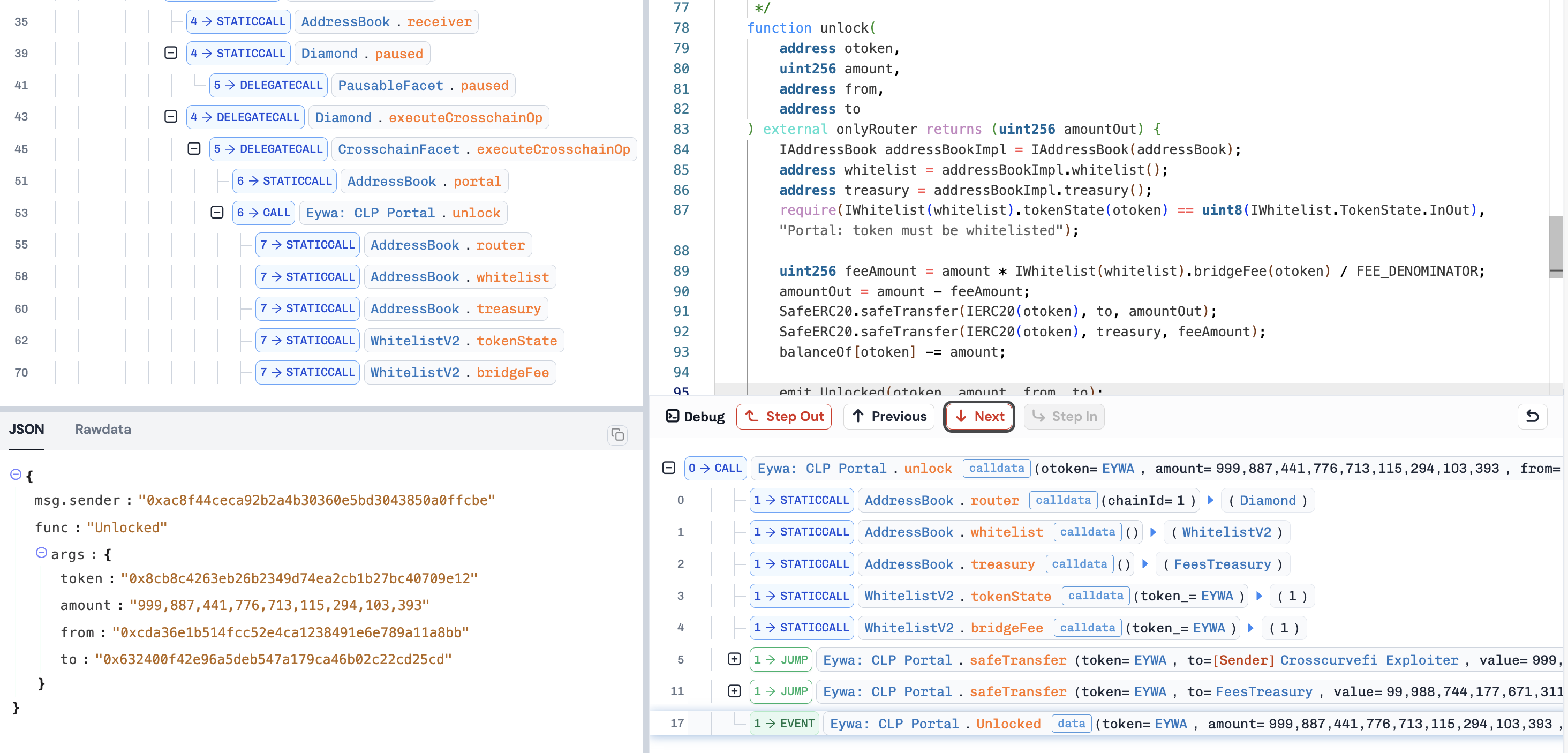 其实刚开始看的时候我还不知道expressExecute和Execute有什么区别,后面才知道这个是漏洞利用的关键。所以看了攻击tx发现有点离谱(攻击者直接就),进入后几个验证就到了PortalV2.unlock解锁和释放资产了。